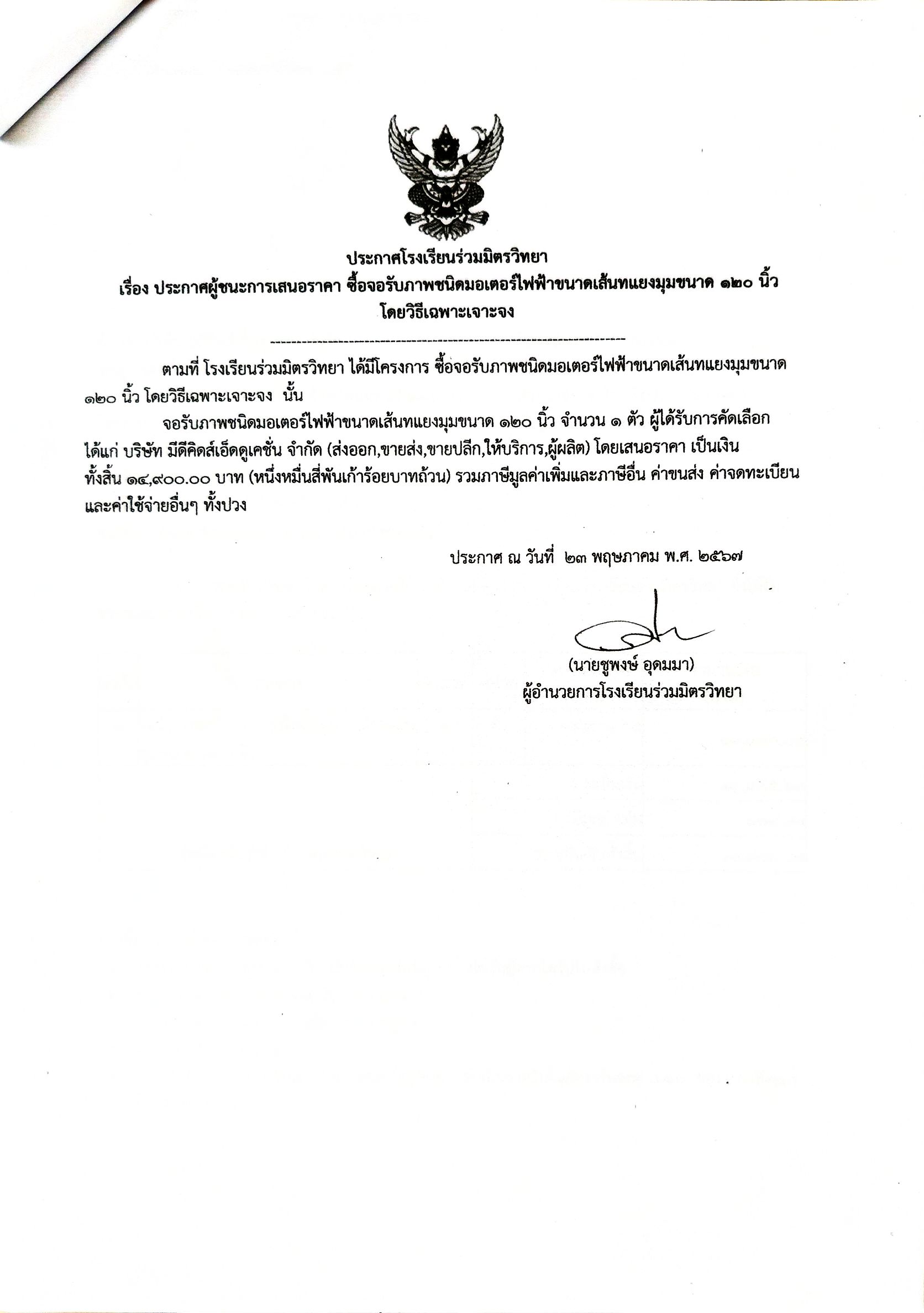 ประกาศผู้ชนะการเสนอราคา ซื้อจอรับภาพชนิดมอเตอร์ไฟฟ้าขนาดเส้นทแยงมุมขนาด ๑๒๐ นิ้ว โดยวิธีเฉพาะเจาะจง
